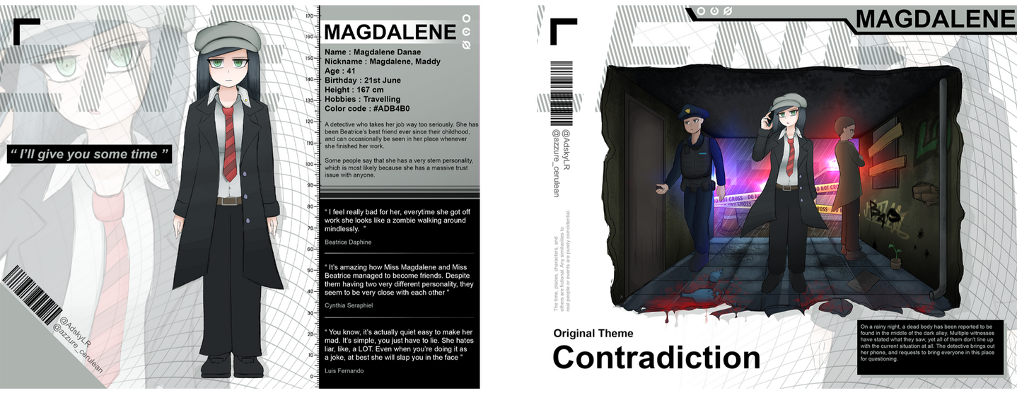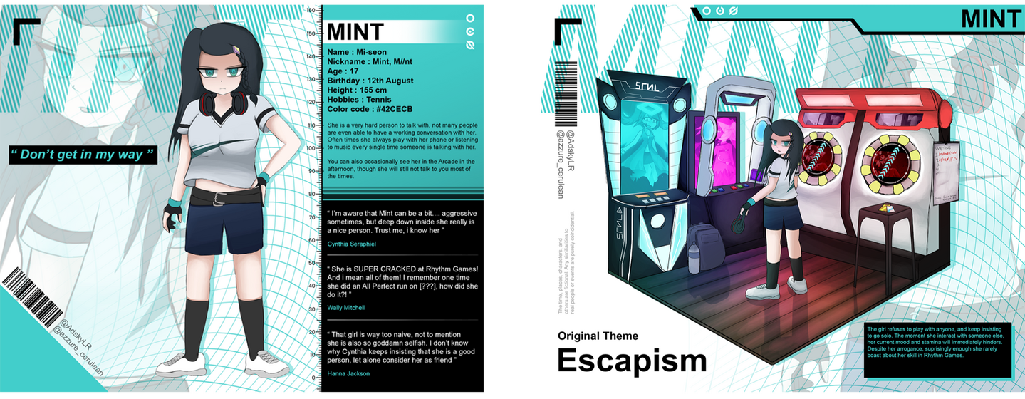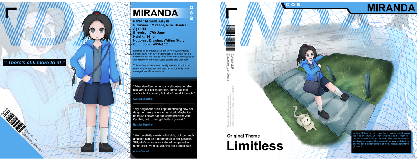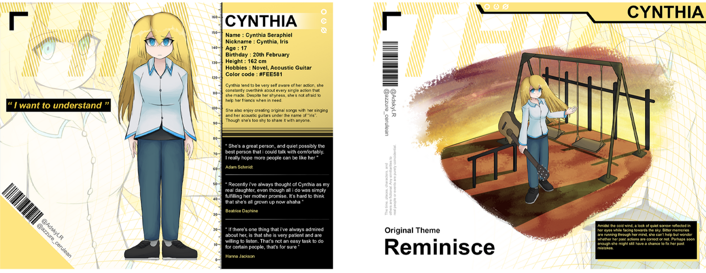 These are the current OC's that i have. Do note that some are unfinished and some may even be changed/removed in the futureAll of my OC characters (so far, at least) all live in the same world, but they all have their own different struggle and stories to tells. Fun fact! Each of them also represent part of me as a person as well. For example, i really like to discover new things, just like Miranda. I got annoyed over the most miniscule things ever, just like Mint. I get anxious whenever i talk with someone, just like Cynthia. You get the idea