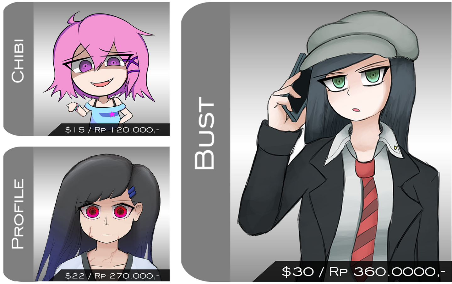 • Prices may vary depending on how complex the drawing is (including background)• Please provide clear references and as much as possible• Multiple characters will still increase the price normally• Revision can be done, as long as it's not too much• If you have any other questions, contact me through DM! (Twitter or Discord)